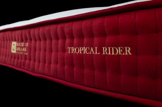 Tropical Rider vas prenosi na spokojne obale, s uzorkom inspiriranim valovima uparenim s bogatim bordo crvenim rubovima. Njegov glavni materijal su održiva KOKOSOVA VLAKNA za plutajuću potporu, u kombinaciji s drugim prirodnim materijalima, uključujući LATEKS i NLD GOTS VUNU/ORGANSKU PAMUK, koji osiguravaju hladno i prozračno, ali i luksuzno, zdravo i dugotrajno iskustvo sna koje se osjeća kao bijeg u raj.